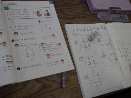 2年生は算数でひき算の学習をしています。2ケタ引く2ケタのくり下がりがあるひき算です。ひっ算をノートに書いて練習していました。