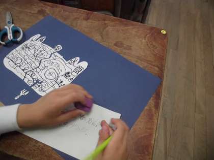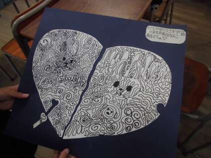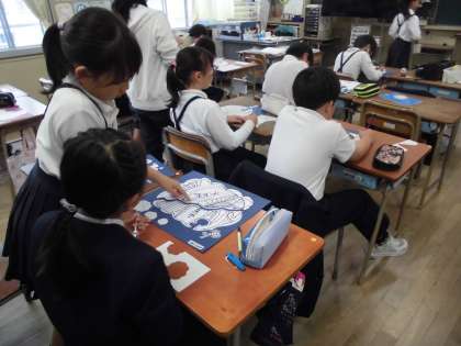 4年生は図工で「不思議な〇〇のカギ」の線描をしています。複雑な線の中に、いろいろなものが隠されていて子どもたちの工夫が光ります。作品カードには絵の解説が書かれています。出来上がった作品をみんなで鑑賞するのも楽しみです。