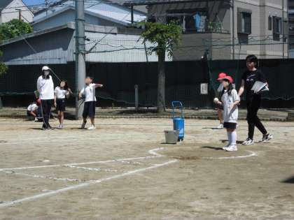 いよいよスポーツテストが始まりました。講堂には立ち幅跳び用マットやシャトルランのモニターが、運動場にはそソフトボール投げと50メートル走の白線が準備されています。5年生がソフトボール投げの測定をしました。高く遠くに投げる練習を講堂でも熱心に行っていたので、遠くにとばしていました。