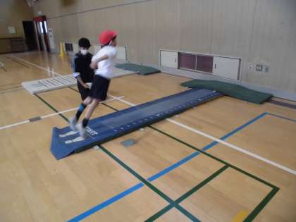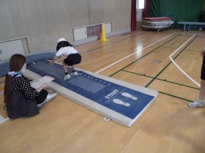 2年生も体育でスポーツテストを行っています。この日は、立ち幅跳びを測定しています。手を大きく振って前に跳ぶ練習をし、本番は2回跳ぶことができます。みんな、いい記録が出ると大変喜んでいました。