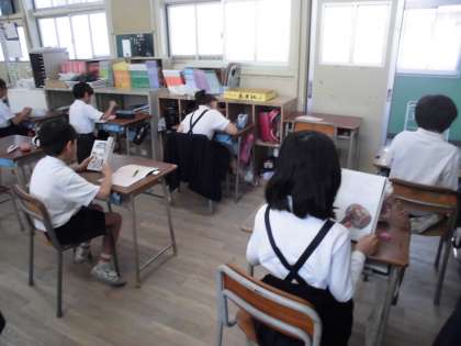 4年生がクラスで読書を行っている様子です。学校では、隙間時間を利用して、読書を行い少しでも多くの本を読む活動をしています。読み終わった本は読書ノートに記録します。学級文庫も充実しています。