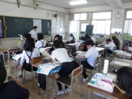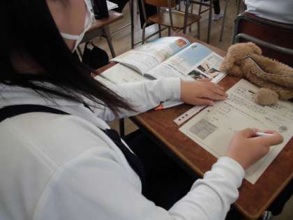 6年生では家庭科で「暑い夏を快適に過ごす工夫を話し合おう」の学習をしました。窓から入る暑い日差しをさえぎるためにはどんなことをしたらよいか、よく考えていました。ワークシートには、カーテンやすだれなどの絵を上手に書いていました。