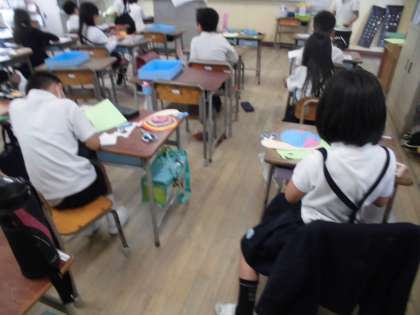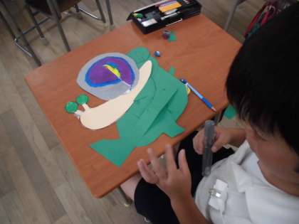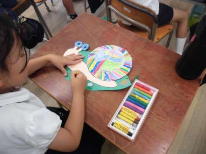 2年生は図画工作科で「カラフルなカタツムリ」を作っていました。それが、見事完成していました。2年生のカタツムリはからが立体的で、葉っぱの上にちょこんと乗っています。葉っぱにも模様を描くなど、それぞれ工夫をしていました。