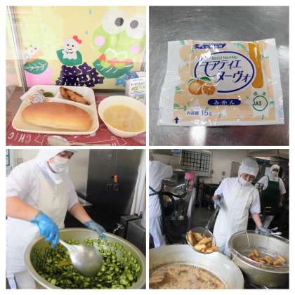 献立は、サーモンフライ・豆乳スープ・きゅうりのバジル風味サラダ・コッペパン・みかんジャム・牛乳でした。