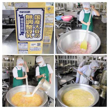豆乳スープは、ベーコンで旨みを出し、じゃがいも・たまねぎ・にんじん・コーン・むきえだまめを使用し、豆乳のまろやかさを生かした彩りのよいスープでした。