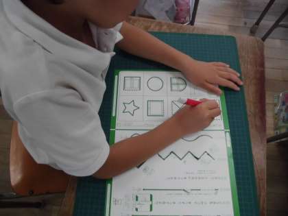 2年生は図画工作科で「まどからこんにちは」の教材に取り組んでいます。カッターナイフをつかって、厚紙を切り、窓を作ります。カッターナイフの扱い方を先生から教わると、おそるおそるにぎりしめてしっかり持って切っていました。