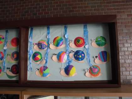 今月は2年生の作ったカタツムリが玄関をいろどっています。立体的でカラフルなカタツムリができあがりました。