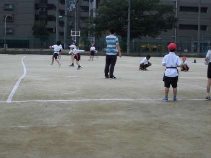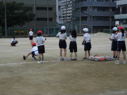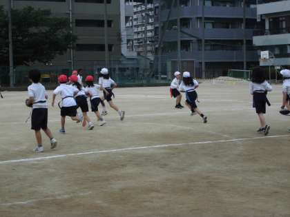 3年生は体育でラグラグビーの学習を続けています。タグをとる練習から始めていましたが、小さなラグビーボールを持って走る練習になってきました。