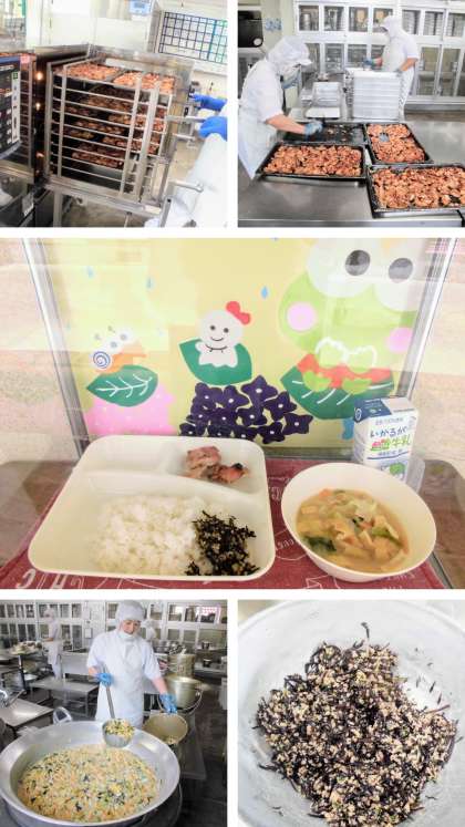 献立は、鶏肉のてり焼き・みそ汁・魚ひじきそぼろ・ごはん・牛乳でした。