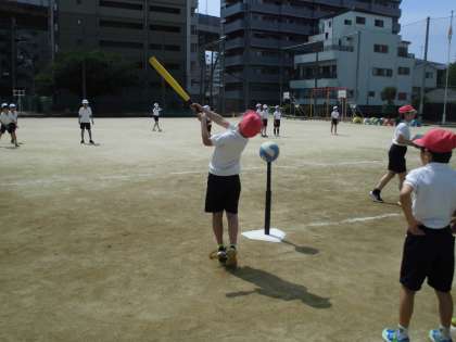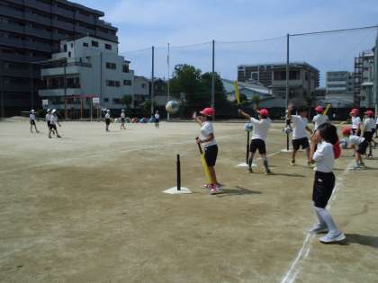 4年生は体育でTボールの学習をしています。運動場にバッティングティーを並べて、遠くに打つ練習です。バットを大きく振って、遠くにとばしていました。たまには空振りもあり楽しそうでした。