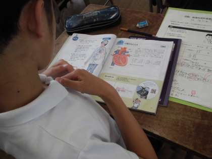 6年生は理科で血液の流れについて学習しています。教科書では静脈を通る血液を青で動脈を通る血液を赤で表しています。体の中で血液は心臓から送り出され、心臓に戻ってきて、循環しているのだということを知りました。
