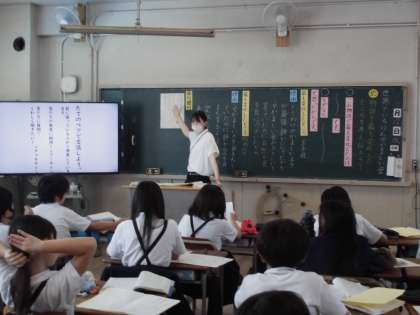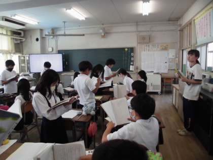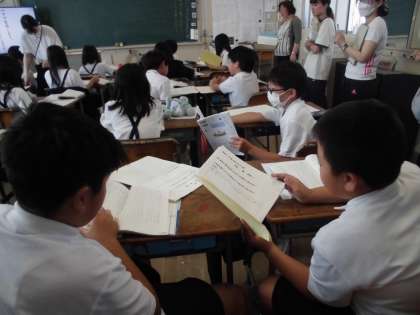 5年生は国語「世界で一番やかましい音」の学習で授業研究を行いました。たくさんの先生方が授業を参観する中、子どもたちは熱心に学習していました。友達の意見を聞いて拍手をしたり、ペアで考えたり、学び合う子どもたちの姿をみることができました。