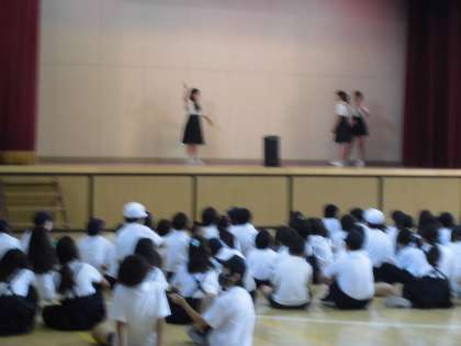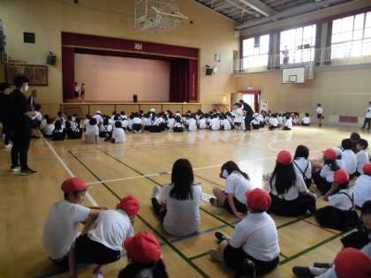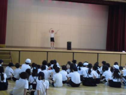 児童集会では、ジェスチャーゲームを行いました。楽しい問題にみんなで答えました。