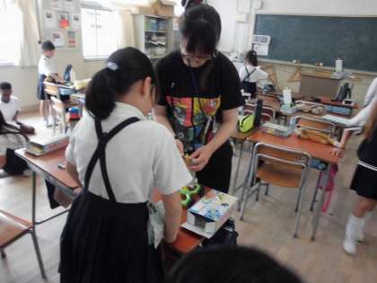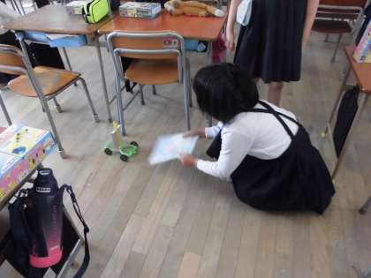 3年生は理科で「風とゴムの力のはたらき」を学習しています。この日は、風の力のはたらきを風で動く車を使って学習していました。風の強さを変えると速さがどうなるか、楽しそうに実験していました。