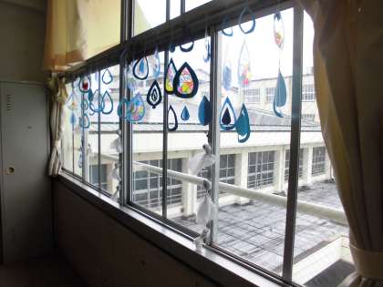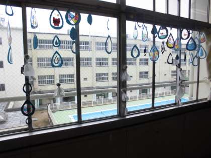 4年生は昨日から窓にたくさんのてるてる坊主を作って、プール開きを楽しみにしていました。でも、あいにくの雨で、プールには入れませんでした。次を楽しみに。