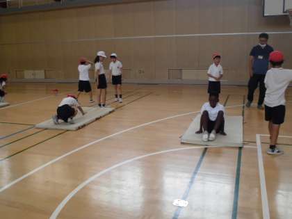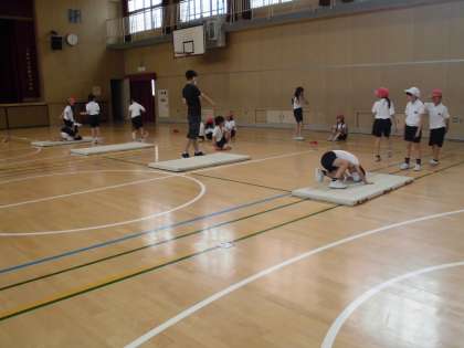 3年生は体育でマット運動をしています。前転、後転だけでなく開脚前転、開脚後転などいろいろな技ができていました。
