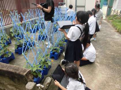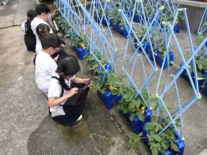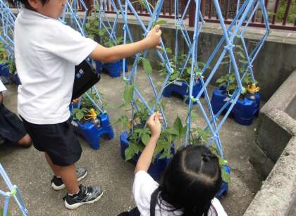 1年生が生活科で植えた朝顔がずいぶん大きく成長しています。先日、3年生にタブレットの使い方を教えてもらった1年生はカメラ機能を使って朝顔の撮影に挑戦しました。いろいろな角度から上手に映すことができました。
