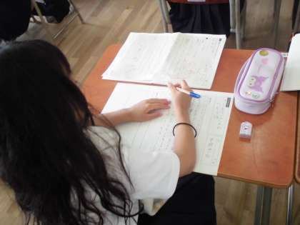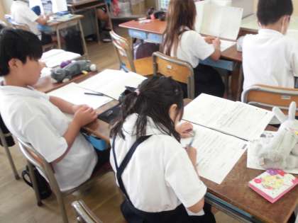 3年生は国語でワニのおじいさんのたから物の学習を進めています。この日は熱心にあらすじをまとめていました。これまでの要約の学習を活かして限られた字数で上手にまとめていました。