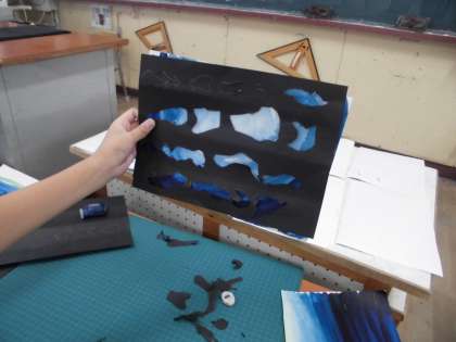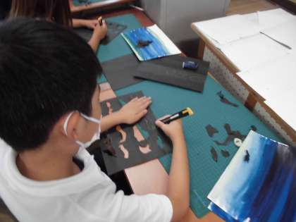 3年生は図工でカッターを使って形のしりとりをしています。バックのグラデーションの絵と合わせるとすてきです。