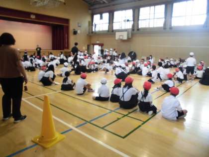 児童集会でじゃんけん列車をしました。たてわり班でつながって先頭どうしてじゃんけんをしました。最後に先頭になった人に拍手をしました。