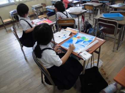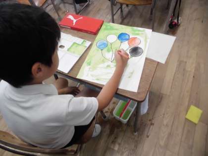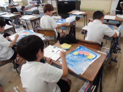 2年生は図画工作で絵の具の練習でグラデーションを練習していました。濃いところから薄いところの進むときどうしても絵の具を足してしまうので、きれいなグラデーションにはなりにくく、結構難しいです。