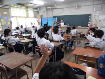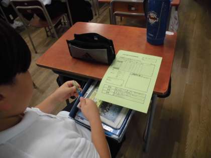 5年生は自然体験学習までの間、毎日、健康観察をしていきます。その説明を児童にしています。当日まで、怪我なく病気なくみんな揃っていけますように。