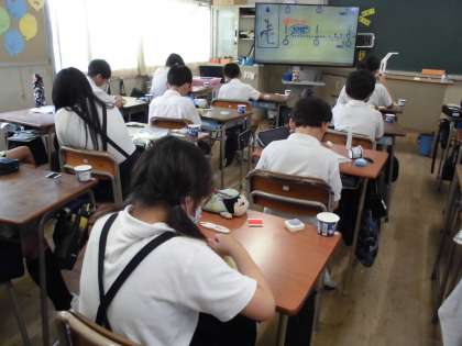 5年生は家庭科で練習布を使って手縫いの練習をしています。この日は半返し縫いについて練習していました。手に汗をいっぱいかいて針がうまく進まない児童もいました。一生懸命練習をしていました。