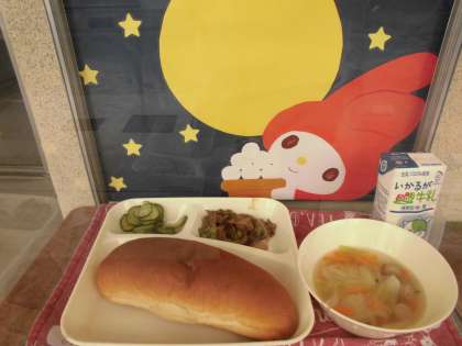献立は、牛肉のソース煮・スープ・きゅうりのピクルス・黒糖パン・牛乳でした。