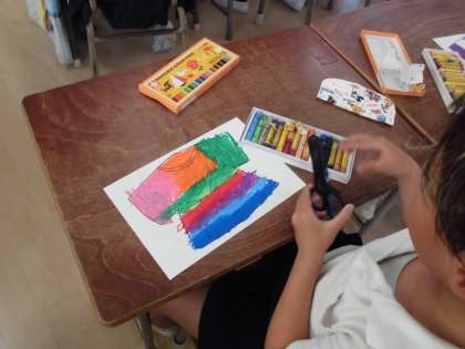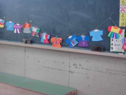 1年生は図工でオリジナルTシャツを描きました。みんな思い思いに描き、カラフルなTシャツができました。