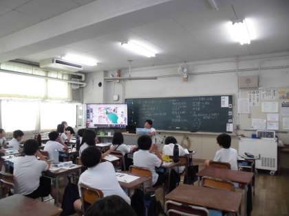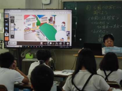 5年生は社会科で台風の被害について考えていました。モニターに町の様子を映し出して、台風が来たとき危ないところ、対策をしないといけないところなどを考えて答えました。