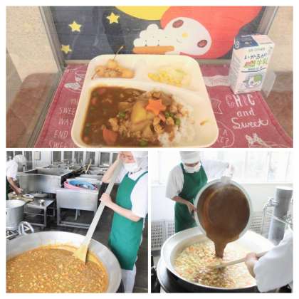 チキンカレーライスは、児童に人気のある献立で、星形のラッキーにんじんが入っています。