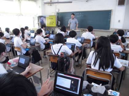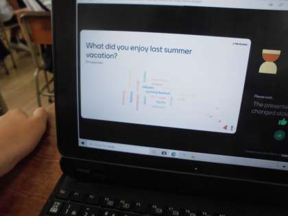 6年生は英語で夏休みに楽しかったことを表現しています。I saw ○○(私は友達にあった)とか、I enjoyed ○○(私は祭りを楽しんだ)とか、学習者用端末に出ているワードをもとに、画像を見て英語で答える学習をしていました。