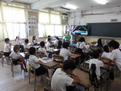 2年生は音楽で「虫の声」の歌を学習しました。映像と音声で、「虫の声」の歌詞に出て来る秋の虫の実際の鳴き声を確かめました。「なんて鳴いているかな。」という質問に歌の歌詞を思い出しながら、楽しそうに答えていました。