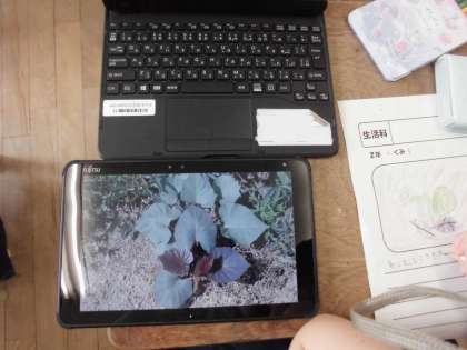 2年生は生活科で育てているサツマイモの観雑をしました。学習者用端末で写真を撮ってきて、観察カードを書きました。