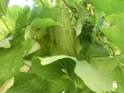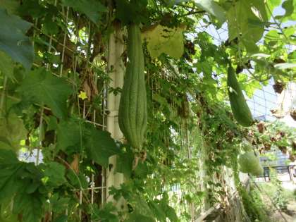 春に植えたヘチマが実をつけ、ぐんぐん大きく成長しています。