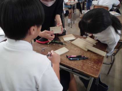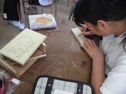 6年生は図画工作で「グランドボックス」を作っています。今は、下絵通りに木の板に写し取って彫刻するところです。思い思いの素敵な下絵ができています。これから木に彫刻刀で掘り進んでいきます。
