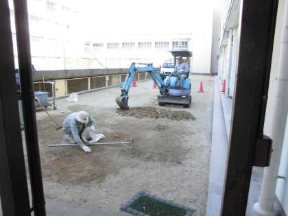 今週は、重機小さいユンボが入って藤棚下とプール前の整地を行います。瓜破北小の地面は、がれきや大きな石がたくさんあり、整地して子どもたちが安全に、遊びやすいように整えます。営繕班の皆さん、管理作業員さん、残暑厳しいなか、ありがとうございます。ユンボで掘ると、とても大きな石がたくさん出てきました。
