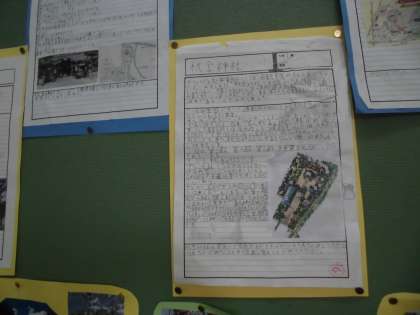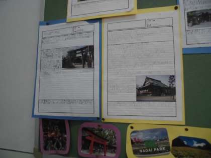 5年生は1学期に「地域の魅力を伝えよう」の学習をしていました。そのリーフレットが完成し、今、北館廊下に掲示しています。大念仏寺、杭全神社、瓜破天神社など地域の歴史ある建物が、詳しく説明されていて、とても良いリーフレットです。