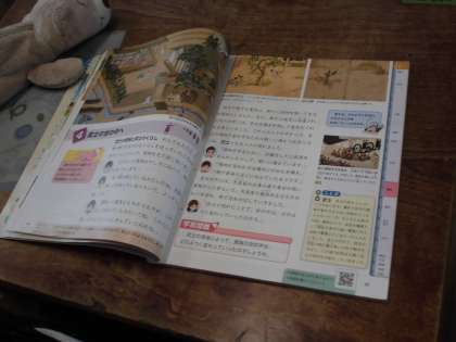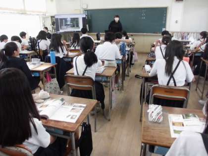 6年生は社会科で歴史の学習をしています。はじめは平安に栄えた平泉の中尊寺金色堂の画像を見て説明を聞いていました。次に、貴族の時代から武士の時代に移り変わると、建物の中の様子もずいぶん違っていることや「武器(刀や弓矢)を持っている」と人々の服装や暮らしぶりを注意深く観察できていました。