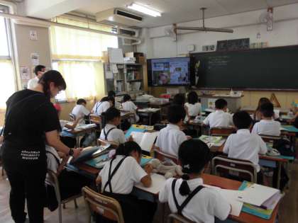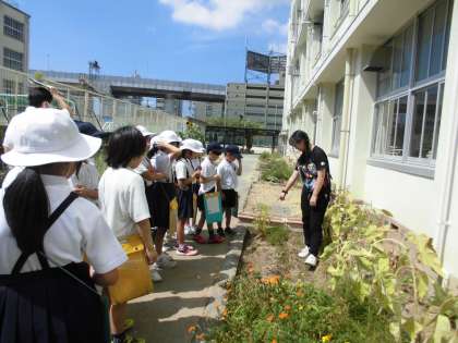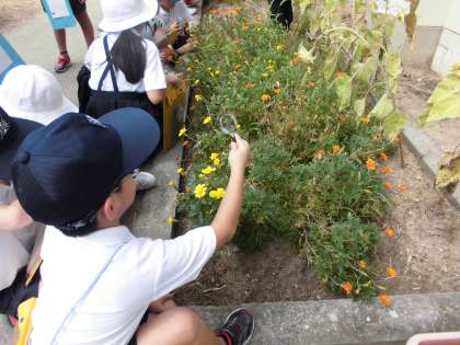 3年生は理科で「花が咲いた後の植物の様子を調べよう」の学習をしています。虫めがねをもって花壇にいき、4月に植えたホウセンカやマリーゴールドの花の様子を観察しました。どちらも花が咲いた後、実がなっていて、種がたくさんできていることが観察できました。