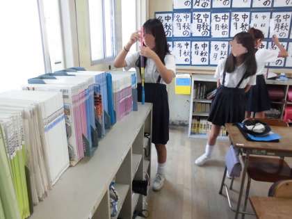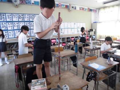 6年生の休み時間の教室の様子です。いま、マジックを高く積み上げる遊びが流行っているようです。「5本まではいけるねんけど」と言いながら、6本目は立てるのが難しいことを教えてくれました。楽しそうに頑張っています。