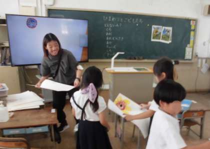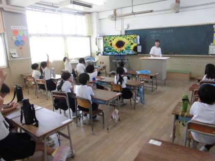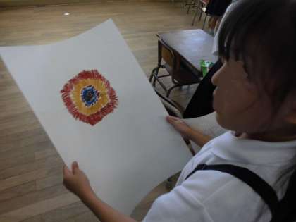 1年生は図画工作で「ひまわり」を描きます。はじめにひまわりをよく観察して、中心にどんな色が見えるか学習しました。茶色だけでなく緑や黒、青、青紫などたくさんの色を見つけることができた子どもたちは、中心から、時間をかけて丁寧に描くことができました。