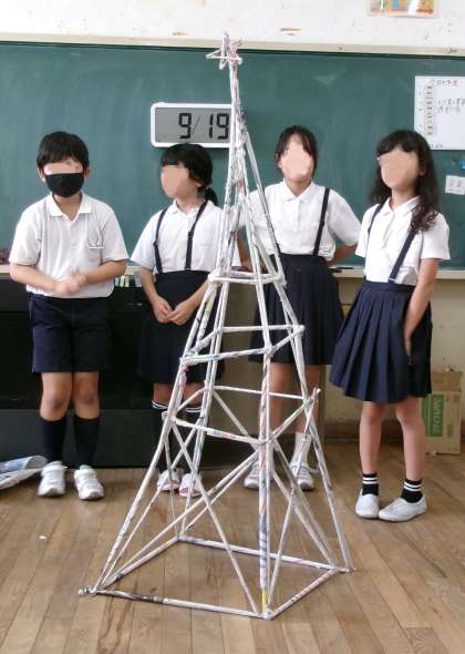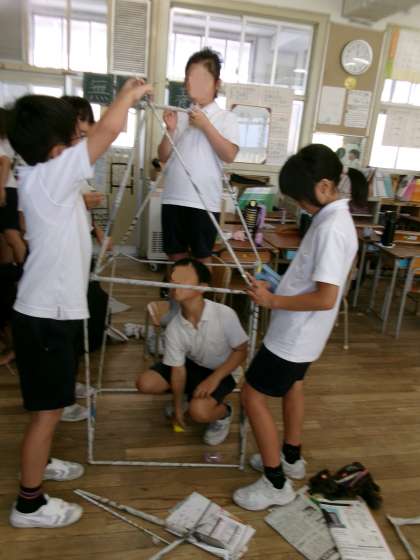 4年生は図工で造形活動「つなぐんぐん」を行っていました。前回は、新聞棒を作成しているところを載せましたが、今回はその新聞棒を使って造形作品を作り上げているところです。グループのみんなで協力しながら、新聞棒をつないで、様々な形に作り上げていました。本当にみんな楽しそうに製作していました。