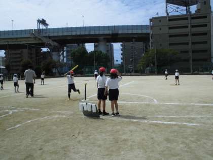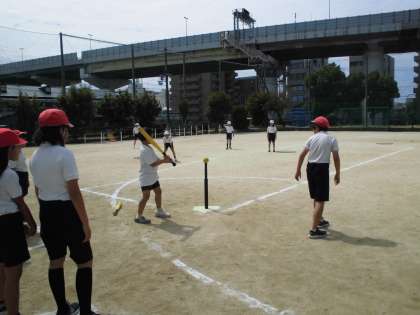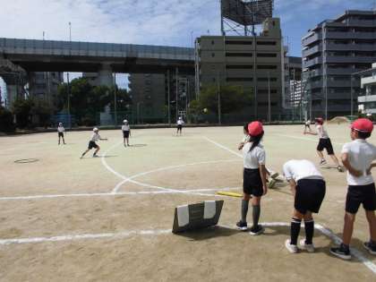 4年生は体育でTボールをしています。9月の中旬というのに毎日暑い日が続く中、子どもたちは楽しくTボールをプレーしていました。上手に打つと、ボールを素早く受け止めチームに回していました。1学期より連携プレーがとてもうまくなっています。
