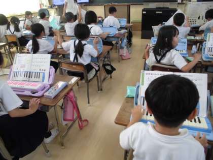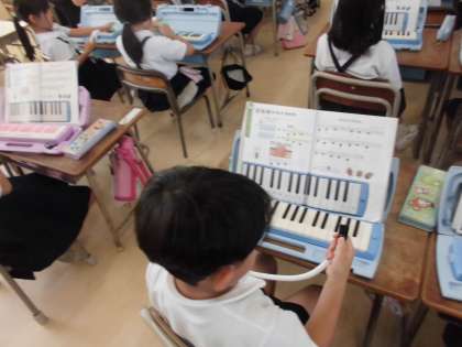 1年生は音楽で鍵盤ハーモニカを練習しています。小さな手で、ドからソまでの音を親指から小指まで使ってしっかり吹くのはとっても難しいですが、頑張っています。