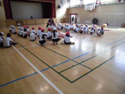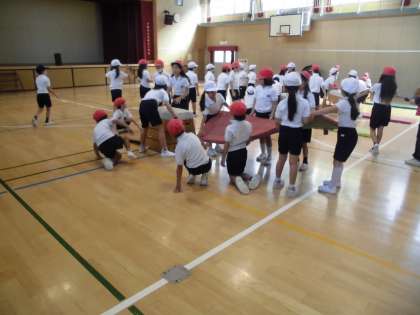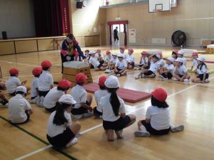 2年生は体育で「とび箱」の学習をしています。手の付き方や踏切の仕方など、先生の話をしっかり聞いています。お片付けも、素早く友だちと協力してできました。