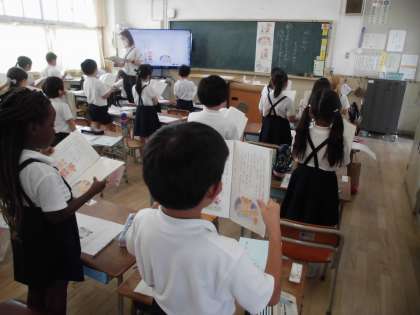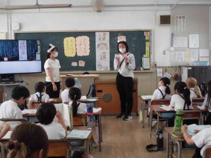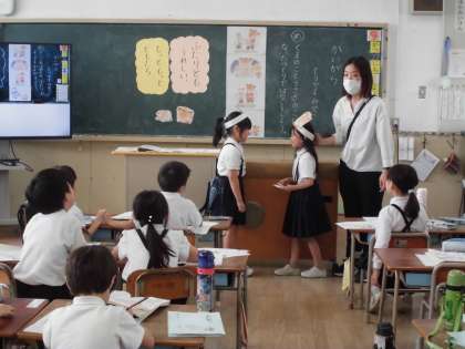 1年生は国語で「かいがら」というお話を学習しています。お気に入りのかいがらをお友だちにあげるくまさんと、もらったうさぎさんの気持ちを想像しながら、会話の続きを考えていました。考えを発表するときには、それぞれの役になりきって、発表できました。