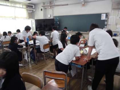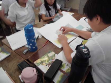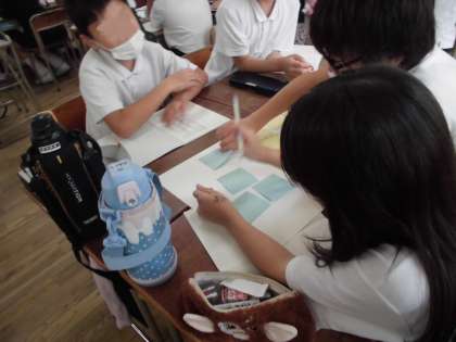 5年生は国語で「問題を解決するために話し合おう」の学習をしています。グループで「給食の準備を早くするためにはどうするか」など、解決したいテーマを考えて、テーマについてどう解決していこうか意見を出し合っています。グループ活動で意欲的に学習しています。