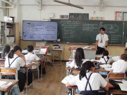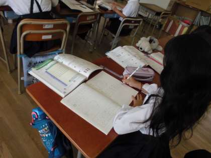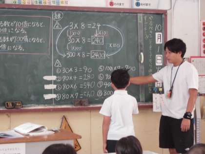 3年生は算数で「かけられる数が10倍や100倍になったら答えはどうなるか」の学習を進めています。みんなノートを見やすく、きれいにかけています。指名された人は前に出て、解答した答えを黒板に書きました。