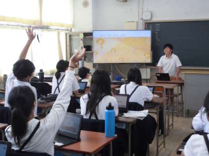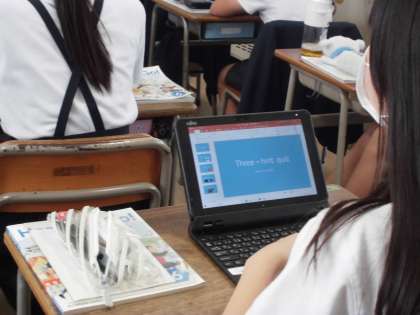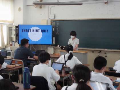 6年生は英語でスリーヒントクイズを作りました。すべて英語で問題を作り、英語でみんなで回答しています。結構難しい問題ばかりです。